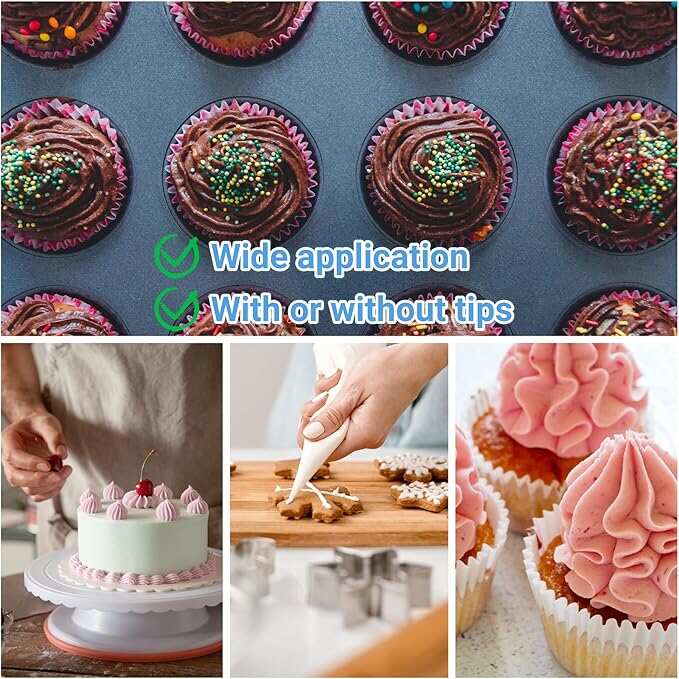 ●WORKS WITH ANY TIPS: These thick and durable pastry bags work well with any sizes of couplers and tips, you can also use without tip or coupler. Wide opening makes bag simple to fill.
